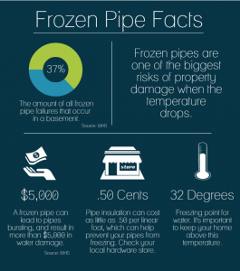 Pipes freeze due to one basic reason: insufficient heat to keep the water inside them from reaching a freezing point. If pipes are kept in climate controlled areas, then all is well. But many are not, such as those installed in an unfinished attic, under a house or inside an outside-facing wall. Sometimes the heat from inside the house will be enough to keep the water in these pipes from freezing. But all it takes is a well-intentioned vacationer, turning down the thermostat to save power while they are absent to send these pipes into the danger zone. Vacationers then return home only to be greeted with massive water damage from a frozen pipe they didn’t see coming because they set the (inside) thermostat to a temperature above 32°F. According to the Building Research Council at the University of Illinois, once the outside air hits 20°F homeowners should be wary of pipes freezing. As a precaution, inside temperatures should never be set below 55°F.